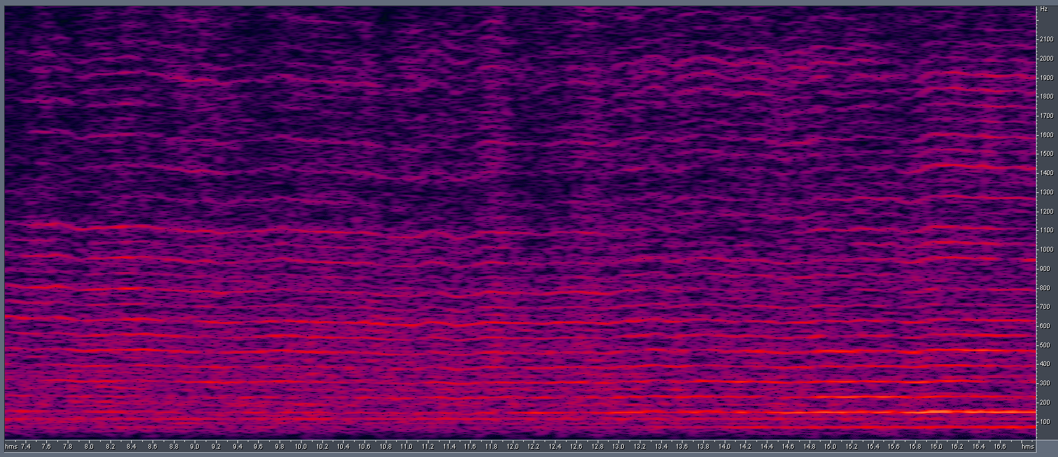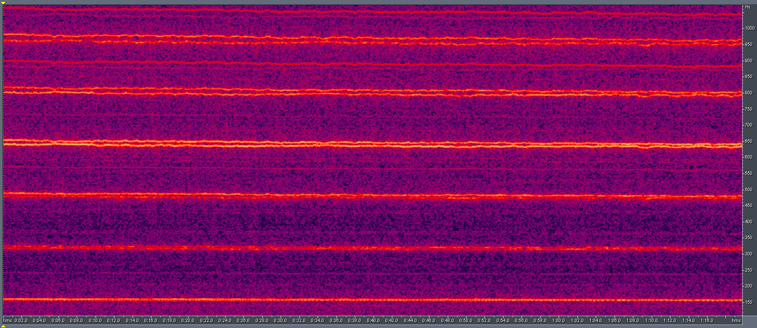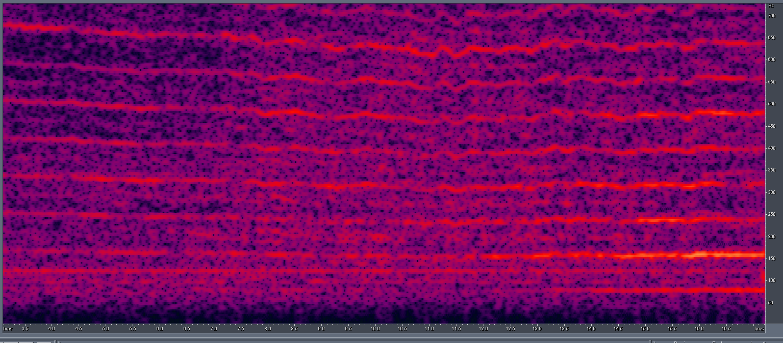 По горизонтали здесь, как и на всех графиках, — время, по вертикали — величина, кратная периоду (но можно говорить и о частоте) основного тона, цвет — интенсивность. Стабильная горизонтальная прямая линия демонстрирует постоянство оборотов двигателя. На кучу всяких артефактов сверху не стоит обращать внимания, поскольку данную программу я писал под совершенно другую исследовательскую задачу.