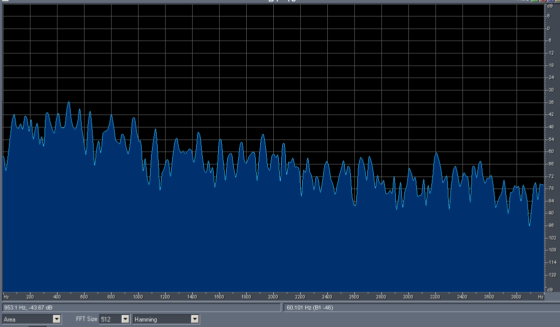 Здесь мы видим амплитуды гармоник (в логарифмическом масштабе) на частотах, кратных основной частоте. Кстати, в биологии есть какой-то закон, согласно которому наше ощущение пропорционально логарифму от величины раздражителя (например, акустического давления).