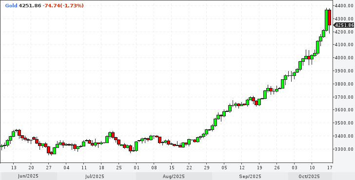 Золото (XAU/USD) находится на рекордной волне, достигнув еще одного исторического максимума около $4 380 в пятницу, так как инвесторы ищут надежное средство сохранения стоимости на фоне геополитической, экономической и фискальной неопределенности. На момент написания статьи XAU/USD торгуется около $4 280, отступая от рекордных максимумов, так как трейдеры фиксируют частичную прибыль. Несмотря на незначительный откат, металл остается на пути к девятой подряд недельной прибыли.