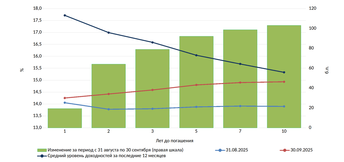 Смотрим на приведенный в статье график "Кривая доходностей ОФЗ (%) и изменение доходностей за период (б.п.) за 2025 г. по ориентировочным объемам заимствования(млрд.р.):