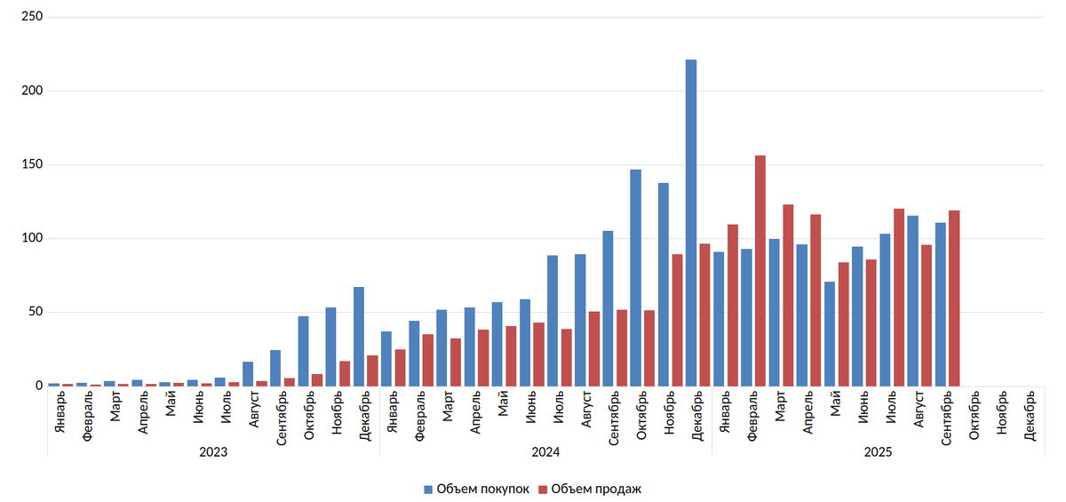Физические лица продолжают выступать основными покупателями акций на вторичном рынке. За сентябрь было куплено ценных бумаг на сумму 43,1 млрд руб. – максимальный месячный объём с 2022 года!