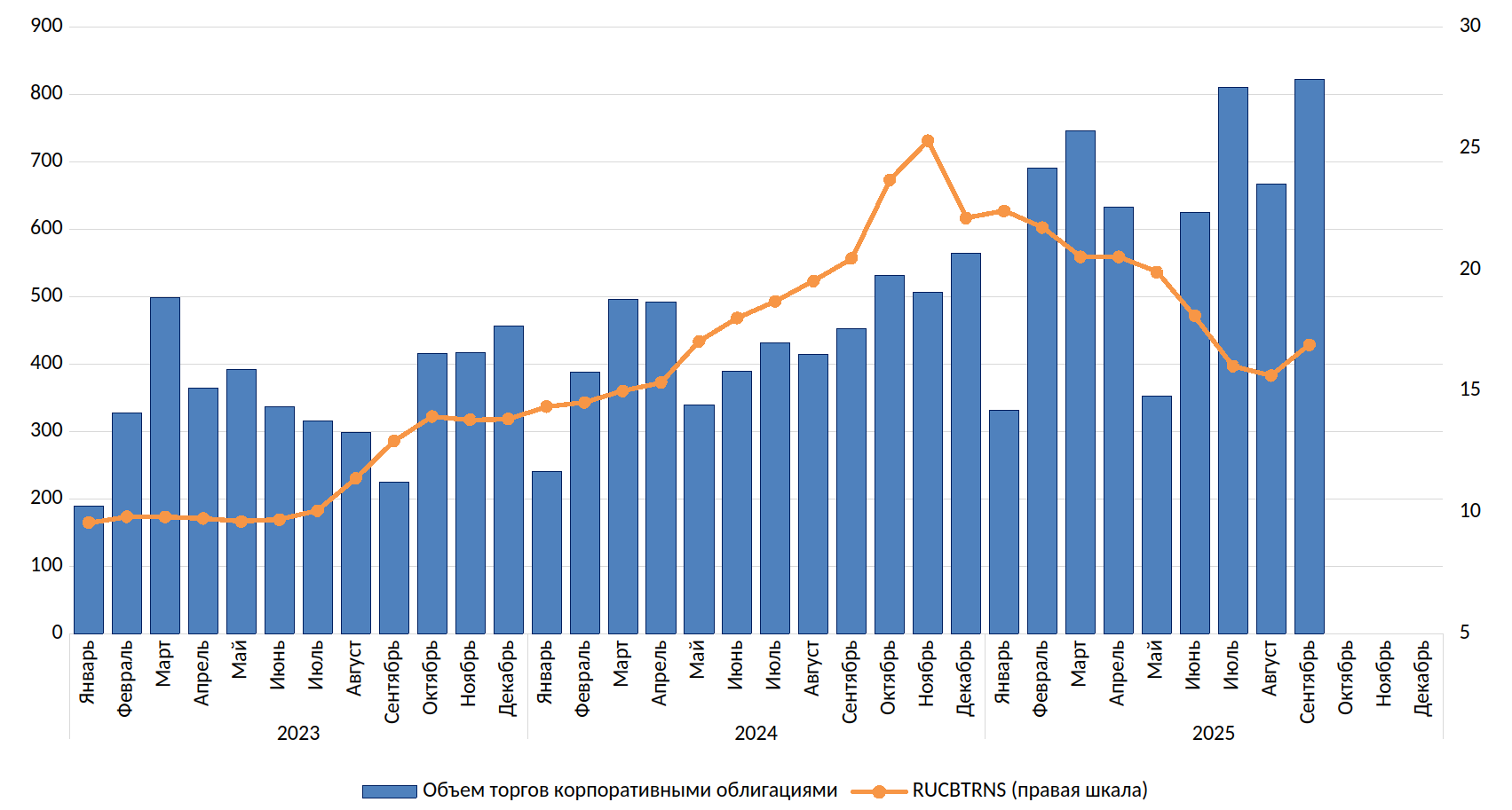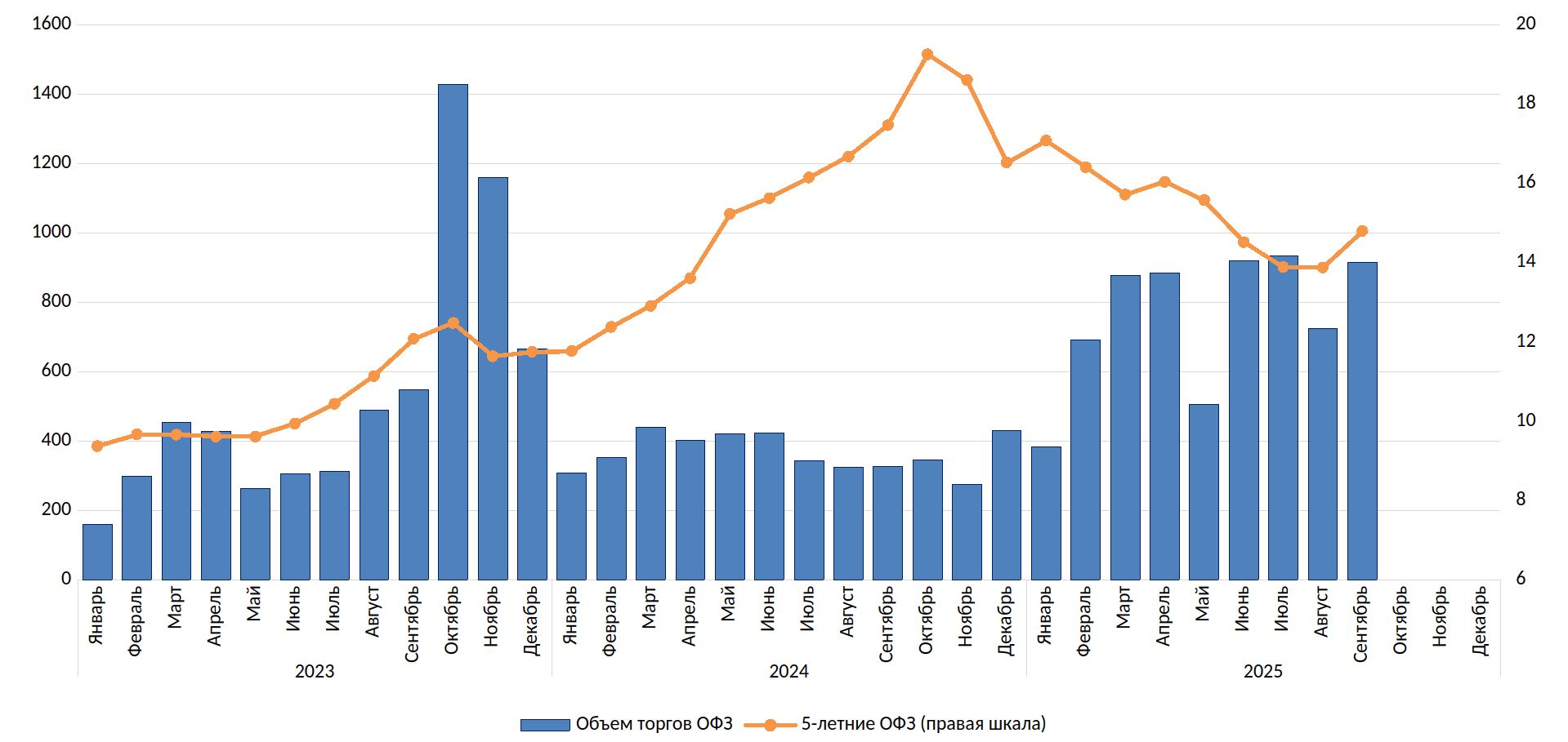Объем торгов ОФЗ на вторичном биржевом рынке (млрд руб.) и доходность 5-летних ОФЗ на конец месяца (%)