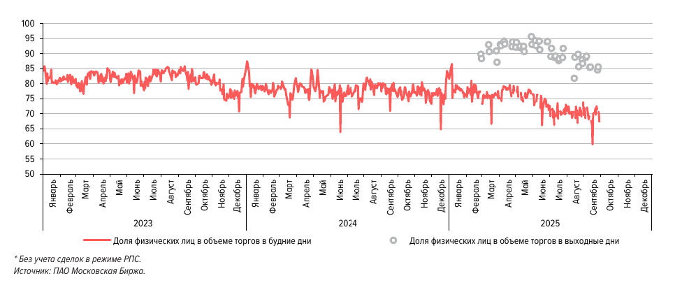 Объём торгов акциями снизился до 87 млрд руб. по сравнению с августом – 112 млрд руб. Средняя доля физических лиц в торгах составила 69,6%.