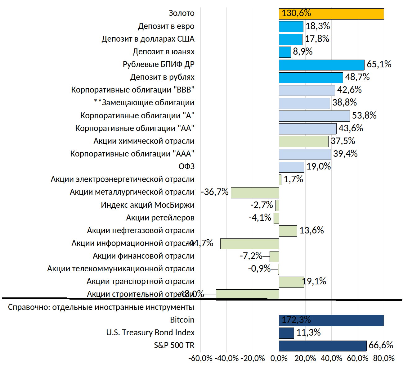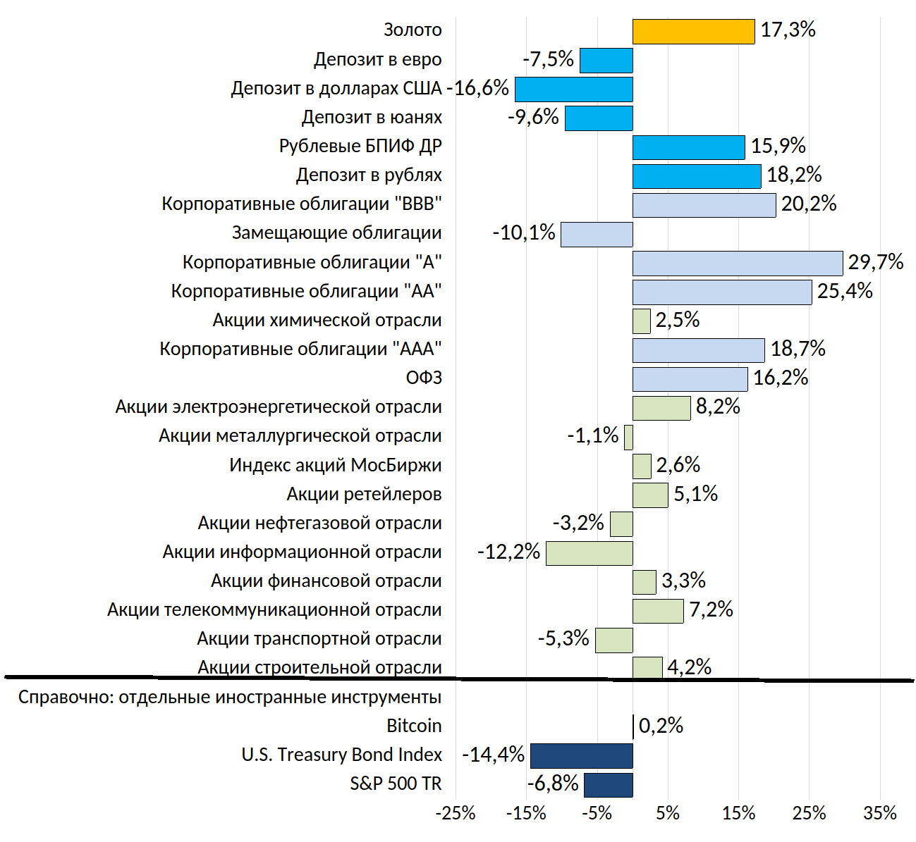 *Доходность вышеобозначенных инструментов рассчитана исходя из полной фактической рублевой доходности за период (учтено изменение цен активов, выплаты дивидендов по акциям и купонов по облигациям). В расчете инструментов, номинированных в иностранных валютах, учтено изменение обменного курса рубля относительно соответствующей валюты. Доходности ОФЗ и корпоративных облигаций рассчитаны на основе индексов RGBITR и RUCBTRNS различных рейтинговых групп с дюрацией более 1 года.