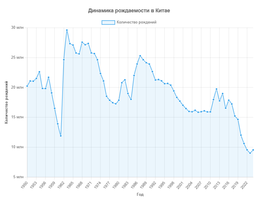 Конечно, у Китая была и другая политика по ограничению рождаемости — она называлась «Поздно, Редко, Мало». Официально её ввели в 1973 году и тогда же начали широко внедрять. Но снижение рождаемости началось ещё раньше. В 1963 году родилось 29,6 миллионов детей, а в 1973 году — уже 24,6 миллиона. Это значительное падение, и оно показывает, что снижение рождаемости началось и до внедрения политики «Поздно, Редко, Мало».