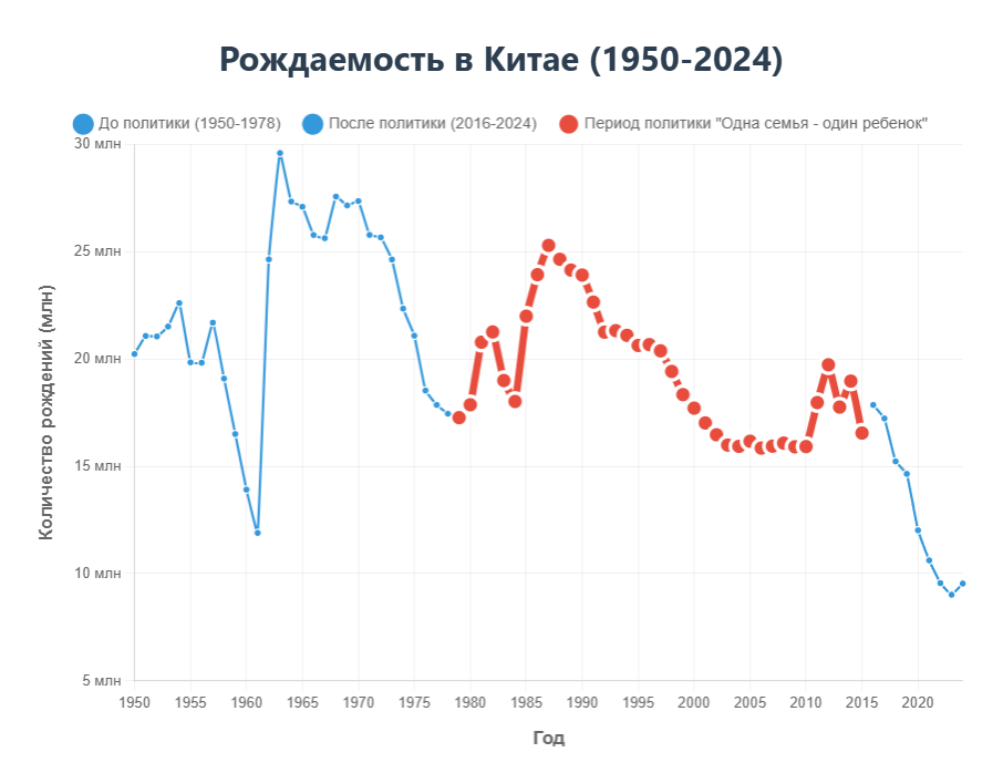 Давайте взглянем на графики рождаемости и разберемся, действительно ли политика ограничения рождаемости в Китае так сильно повлияла на её снижение, как нас уверяют.