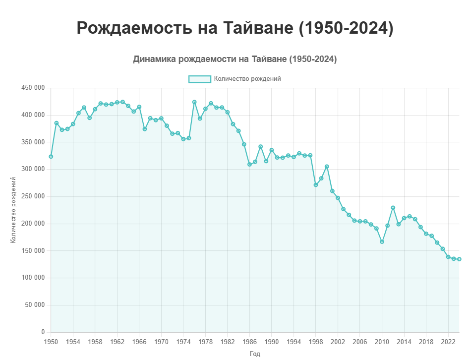 Теперь рассмотрим не менее интересный пример — график рождаемости на Тайване. Его населяют те же китайцы, но политика контроля рождаемости имела там только пропагандистский характер.