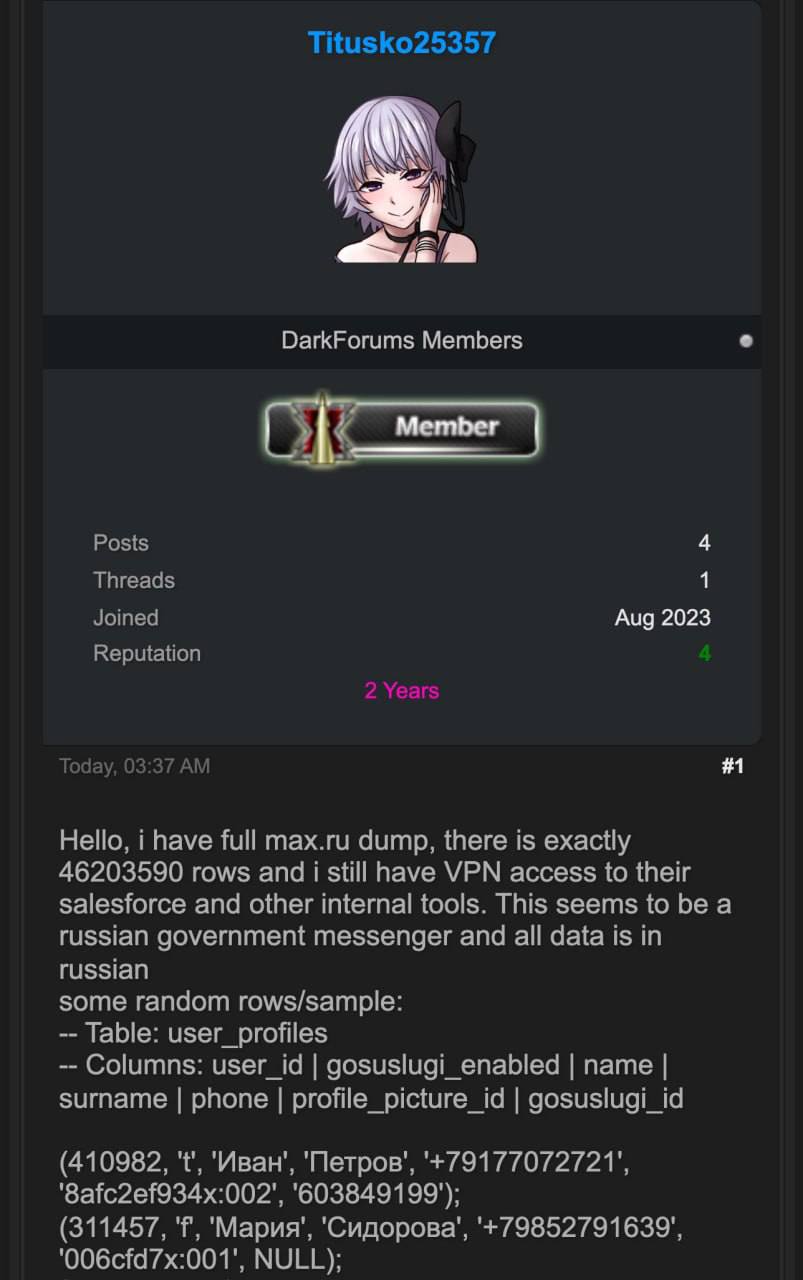 ⚡️Сообщается о масштабном взломе MAX: в сеть якобы ушла полная база — персональные данные и служебные файлы. В пабликах пишут про «47 млн строк» выгрузки. Самый «надёжный» мессенджер, ага.
