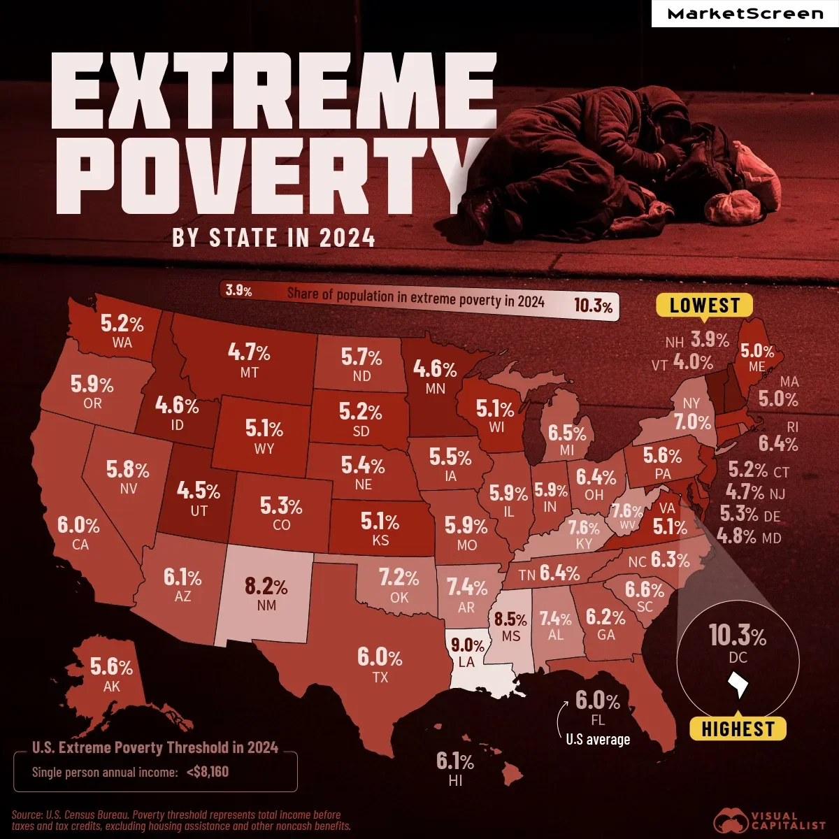 Миллионы американцев живут в крайней нищете, причем в Вашингтоне, округ Колумбия, в 2024 году 10,3% населения будет зарабатывать 8160 долларов или меньше, что является самым высоким показателем в стране.