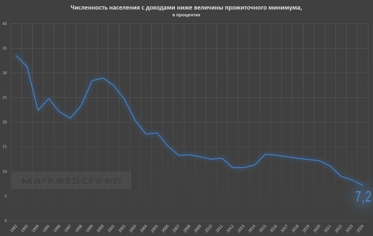 Численность населения с денежными доходами ниже границы бедности (величины прожиточного минимума) по Российской Федерации в процентах от общей численности населения в 2024 году составила 7,2%.