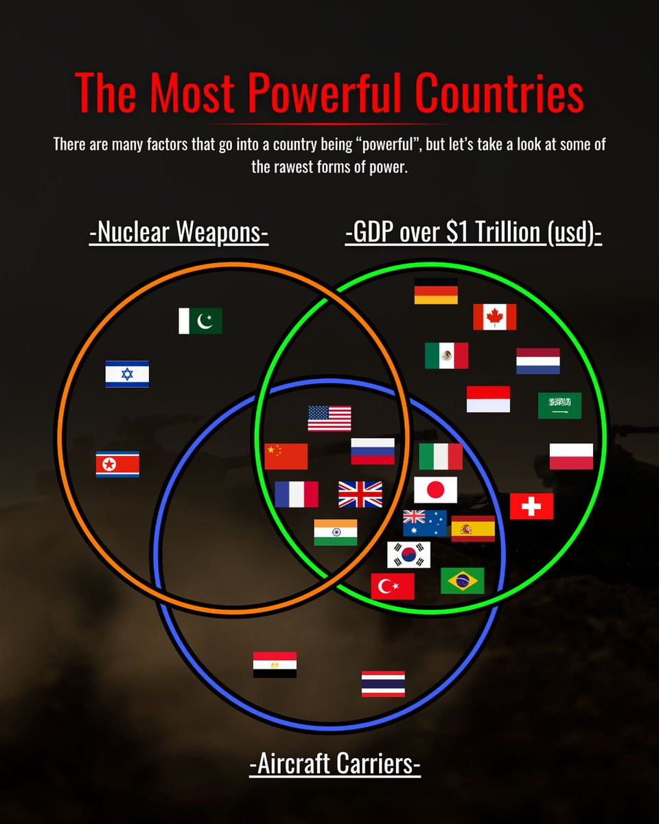 Сделали три круга (ВВП больше 1 трлн $, ядерное оружие, авианосцы), ну и отобрали страны на пересечении всех трёх.