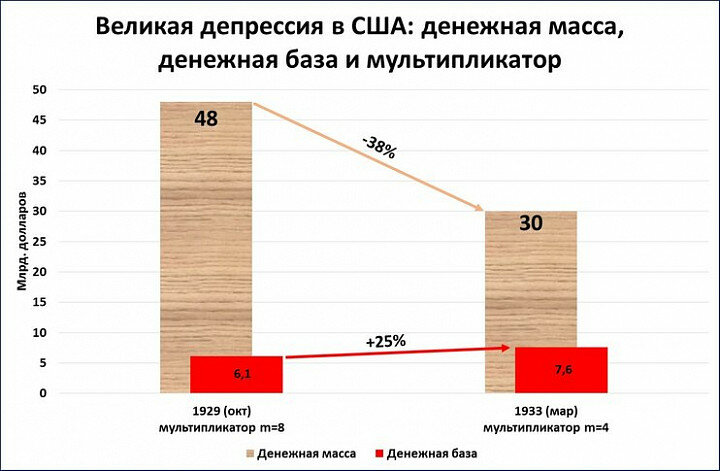 И тут -- смотрите -- чтобы не допустить сильного обвала денежной массы -- власти с банкирами подняли денежную базу. Тогда времена были ещё непросвящённые начально-индустриальные и поэтому делали они это робко, попукивая от страха и вовсе "завалить" финансовую систему. И в результате -- денежная масса упала на 38%, а ВВП США -- на 32-33%. И они тогда ещё радовались, что не слишком сильно всё упало!И возможно уже тогда появились кое у кого мысли, что можно было бы финансовыми рычагами манипулировать смелее. Отметим -- КМ упал в два раза.