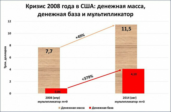 Ну и в заключение суну в нос всем этим непечатальщикам денег один железобетонный факт -- вот эти 400% в пиндосии, это значит что денег там НАПЕЧАТАЛИ в четыре раза больше чем их было. Было - 900 ярдов, а стало 4 трюля! А инфляции НЕ БЫЛО. За счёт того что мультипликатор УПАЛ в ТРИ с лишним раза.