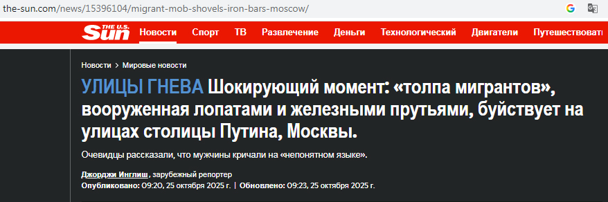 The U.S. Sun сообщает читателям: "Шокирующий момент: «толпа мигрантов», вооруженная лопатами и железными прутьями, буйствует на улицах столицы Путина, Москвы". The Daily Mail не отстает: "Душераздирающие сцены: «толпа мигрантов» буйствует на улицах Москвы, размахивая железными прутьями и лопатами".