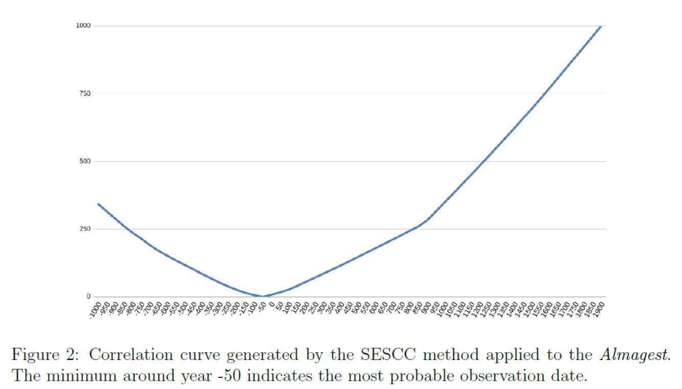 Второй подход, именуемый SESCC (Speed‑Error Signals Cross Correlation — взаимная корреляция сигналов «скорость – ошибка»), является статистической методикой датировки античных звёздных каталогов, прежде всего «Альмагеста» Птолемея. Методика опирается на взаимосвязь между величиной позиционной ошибки звёзд и их собственным движением по эклиптической широте. Указанная корреляция минимизируется при сопоставлении каталога с действительной датой его составления, так как в тот период видимые смещения, вызванные собственным движением, ещё не достигли заметной величины. В результате быстро движущиеся звёзды не имеют систематически больших отклонений по сравнению с медленно движущимися, что устраняет корреляцию между ошибкой и скоростью. Это явление позволяет объективно и воспроизводимо установить эпоху создания каталога.
