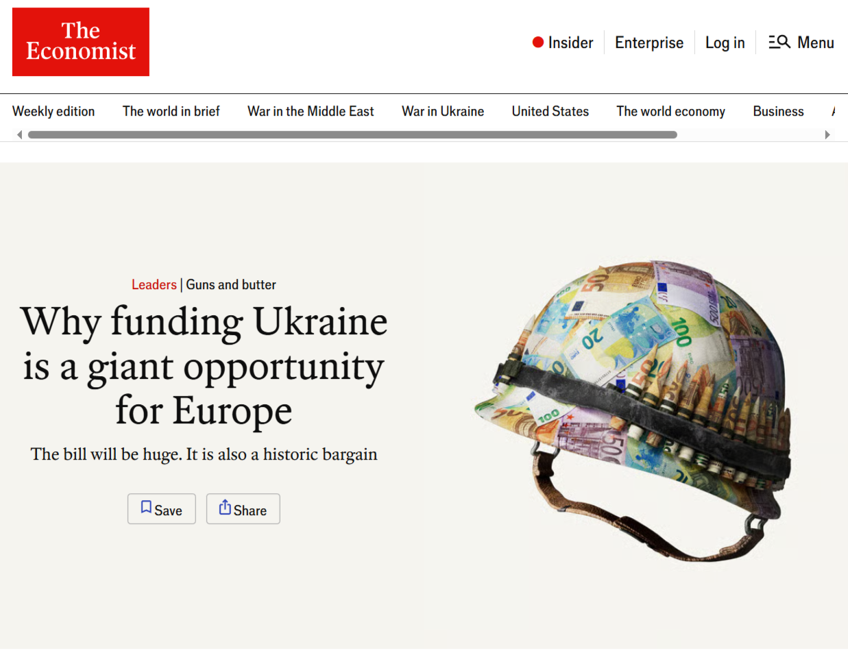Эта газета поддерживает идею конфискации российских активов, но их на 230 миллиардов долларов меньше, чем необходимо. Учитывая масштаб проблемы, с которой столкнулась Европа, было бы оправданно прибегнуть к совместным заимствованиям. Коллективный выпуск облигаций ЕС не только не подорвёт международный статус евро, но и создаст более крупный пул общего долга, укрепит единый европейский рынок капитала и повысит роль евро как резервной валюты. Многолетний план закупок оружия поможет Европе упорядочить развитие своей оборонной промышленности. В краткосрочной перспективе Европа должна без колебаний закупать американское оружие, в котором нуждается Украина, в том числе системы противовоздушной обороны. В дальнейшем расходы должны быть направлены на поддержку европейских оборонных компаний, разрабатывающих собственные системы, а также на поддержку передовых оборонных технологий Украины.