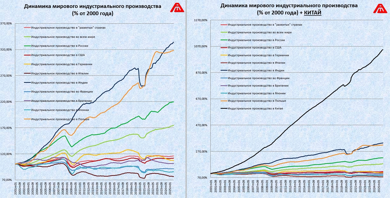 16. Индустриальное производство в процентах от уровня 2000 года (два графика отличаются исключительно наличием Китая, который нарастил производство за период более, чем в 10 раз, и связанным с этим масштабированием):
