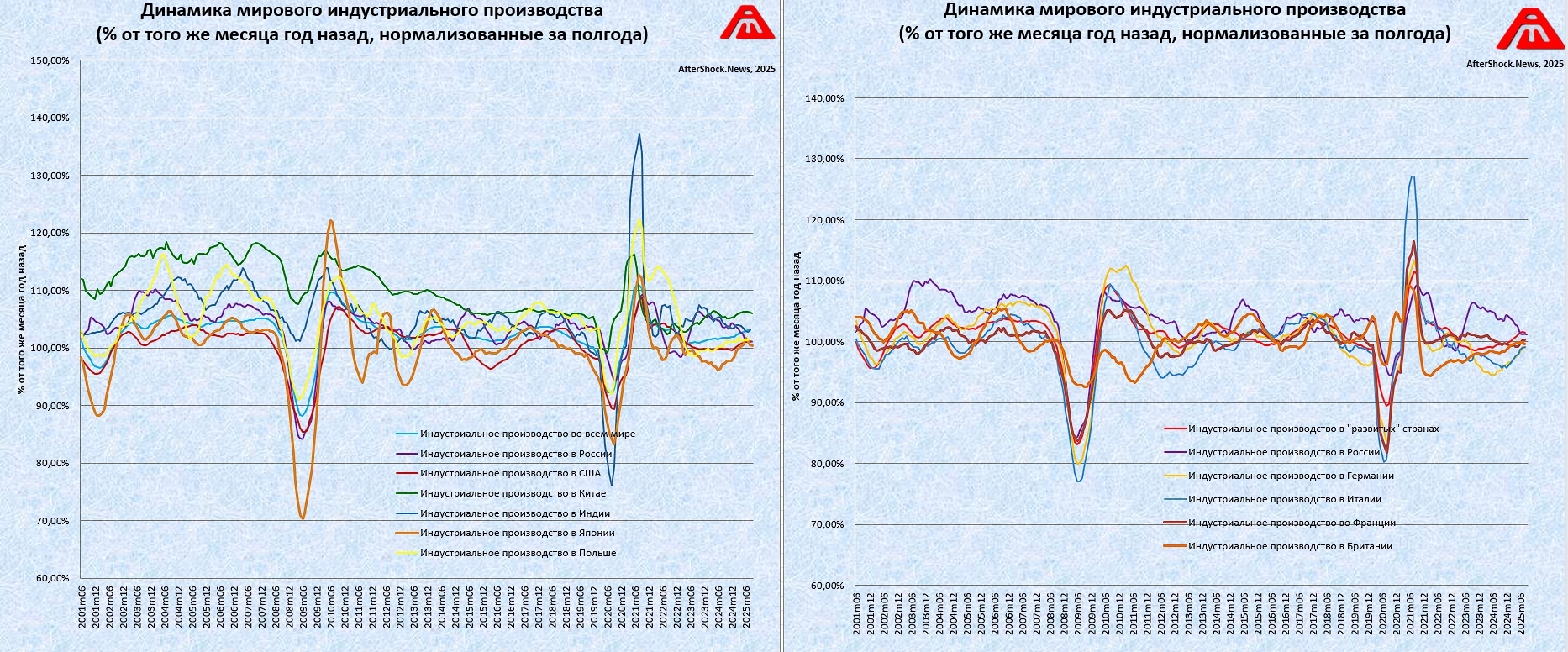 15. Индустриальное производство в процентах от того же месяца предыдущего года с нормализацией за полгода, Россия присутствует на обоих графиках для возможности сравнения: