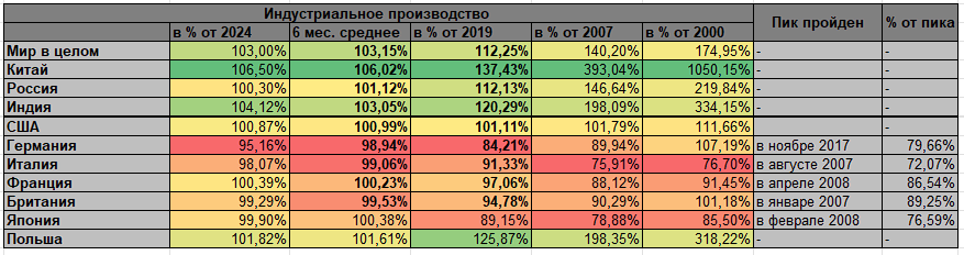 14. Текущий уровень индустриального производства по сравнению с 2000, 2007, 2019 и 2024 годом (первый и второй столбец отличаются тем, что в первом делается сравнение только последнего месяца с тем же месяцем год назад, а второй столбец берет 6-ти месячное среднее), а также когда был пройден пик производства, в тех странах, где он был пройден: