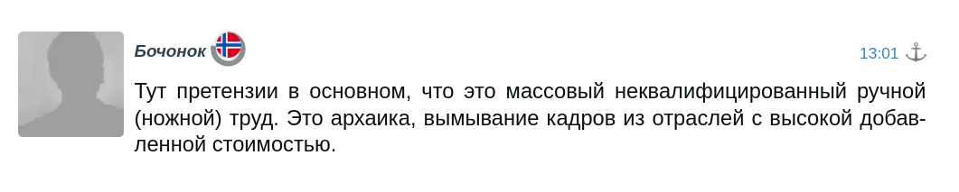Вот так и получается наше диво-дивное: относительно высокие зарплаты на вроде бы максимально трешовых работах и постоянная истерика со всех сторон. Но при этом никто, даже не попытался разложить это все на отдельные составляющие. А там все прекрасно видно: зарплата курьера - это справедливое вознаграждение за простой труд в наших условиях и с нашими ценами, если минимизировать поборы и дать возможность чуть-чуть порешать рыночку. Это именно “рыночно обоснованная” стоимость простого труда у нас.