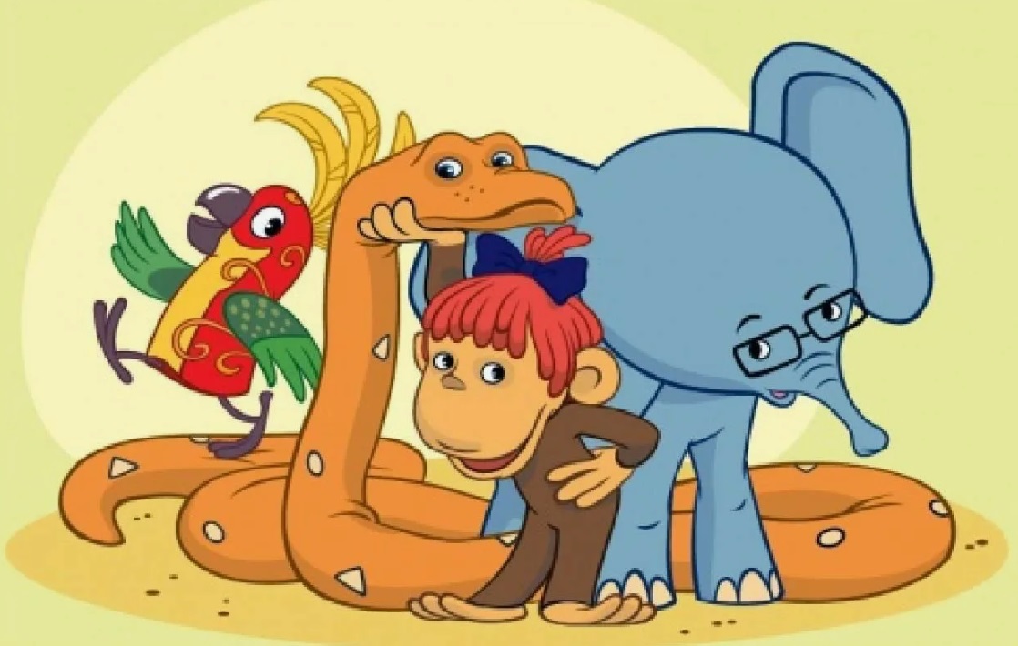 - Совместные действия Все: Мартышка стремительно снуёт, сравнивает с собой. Попугай скрупулёзно составляет сводку: «Считаем: один, следующий...». Слонёнок следит, создаёт страховку. Сам Удав спокойно сносит сравнение, созерцает систему.