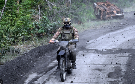 1.5. Как только наблюдение показывает, что противник израсходовал БПЛА первой линии, даётся команда на совершение рывка до позиций противника на основном направлении. Рывок совершается обычно четверкой мотоциклистов. Ориентировочная длинна траектории рывка на мотоцикле в среднем составляла порядка 3 километра. 1 километр мотоцикл преодолевает за 1-1,5 минуты. Максимальная продолжительность рывка на мотоциклах до 7-8 минут. Если используются квадроциклы, то продолжительность рывка сокращается до 5 минут из за худших по сравнению с мотоциклами тактических характеристик квадроциклов (см. ниже п. 28). Для рывка стремятся использовать электромотоциклы, так как они менее шумные, но их использование ограничено сухой погодой. В дождливую погоду и зимой приходится использовать обычные мотоциклы на двигателях внутреннего сгорания. Мотоциклисты доезжают в непосредственную близость от позиции противника, спешиваются и занимают эту позицию. Для рывков до окопов противника, в частности, использовались мотоциклы «Стриж». Атаки старались привязывать к движению солнца, чтобы в момент рывка солнце слепило противника. Во время движения мотоциклы сопровождаются с наблюдательных БПЛА.