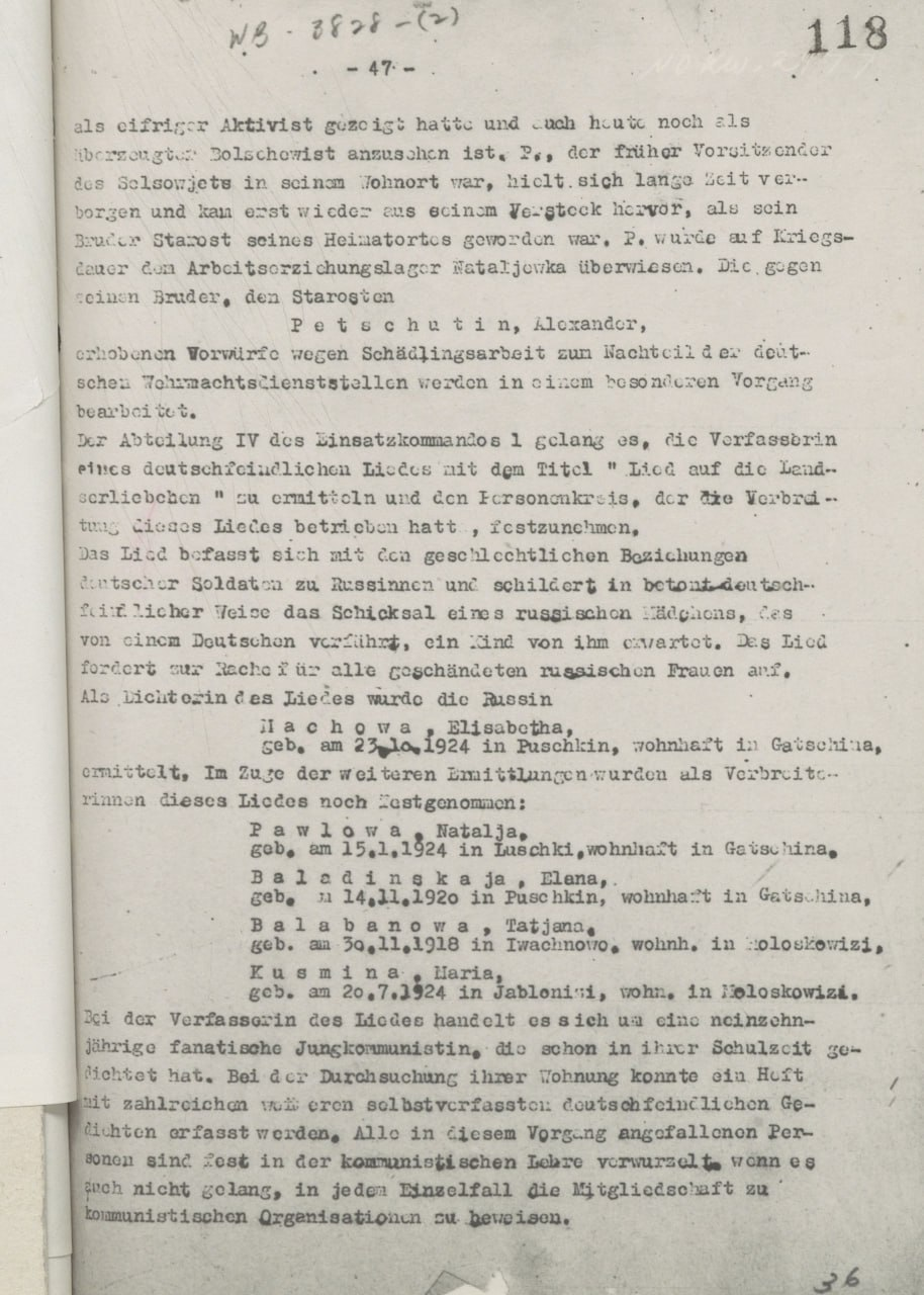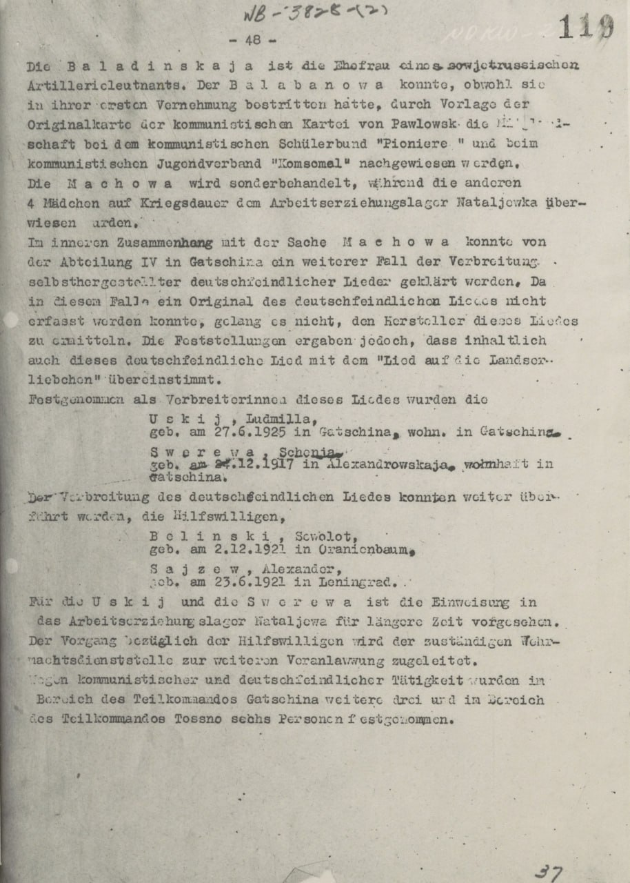 род. 20.7.1924 Яблоницы, проживающая в Молосковицах.Установлено, что автор песни — 19-летняя фанатичная комсомолка, которая ещё школьницей начала сочинять стихи. При обыске её жилья была найдена тетрадь с многочисленными сочинёнными ей стихами весьма германофобского характера. Все задержанные по этому делу лица имеют крепкие коммунистические убеждения, хотя следствию не удалось установить доподлинно, все ли они являются членами коммунистических организаций.
