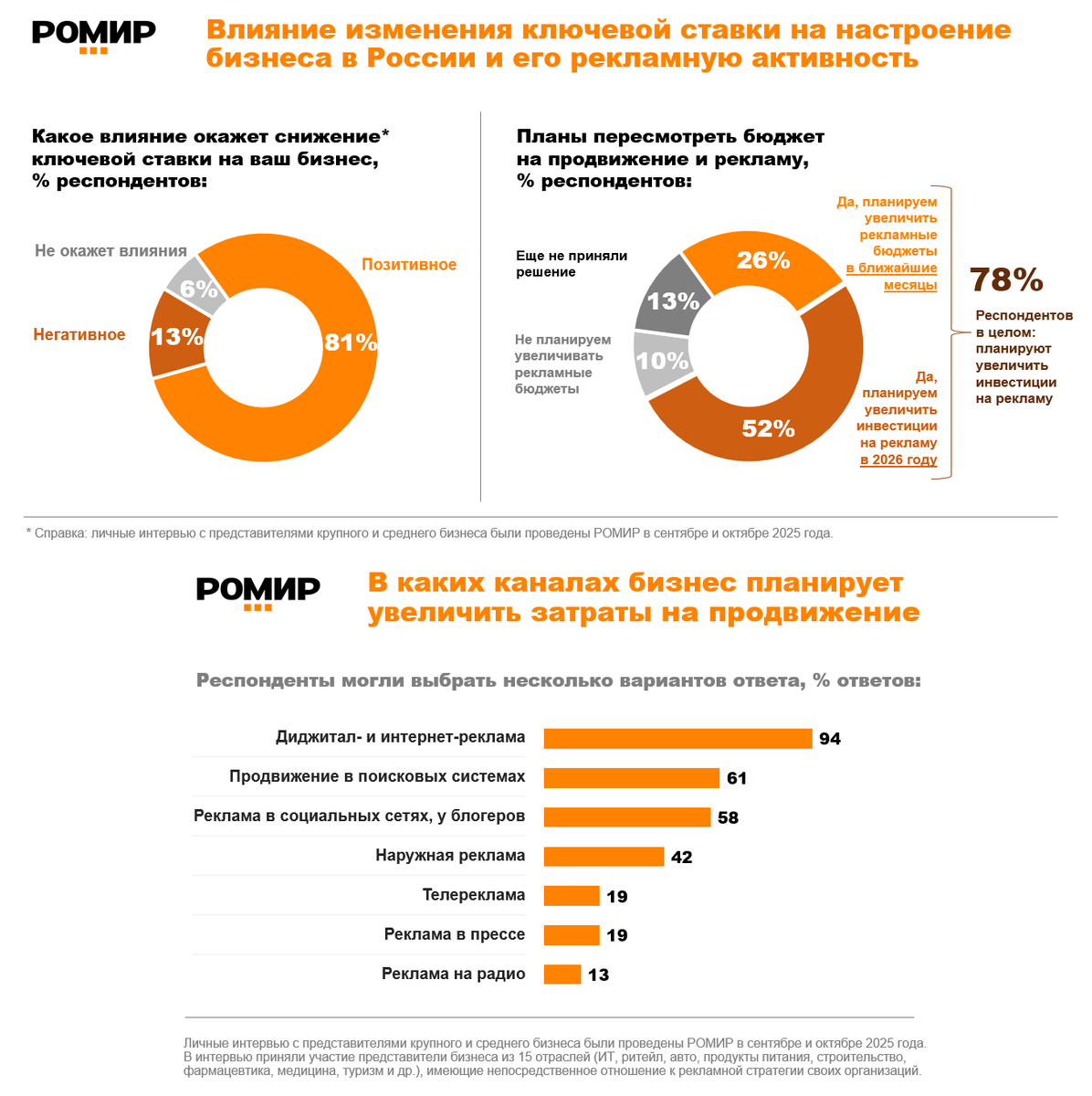 В сентябре — октябре 2025 года РОМИР провел исследование, посвященное влиянию снижения ключевой ставки на рекламную активность крупного и среднего бизнеса в России. В личных интервью приняли участие представители бизнеса из 15 отраслей (ИТ, ритейл, авто, продукты питания, строительство, фармацевтика, медицина, туризм и др.), имеющие непосредственное отношение к рекламной стратегии своих организаций.