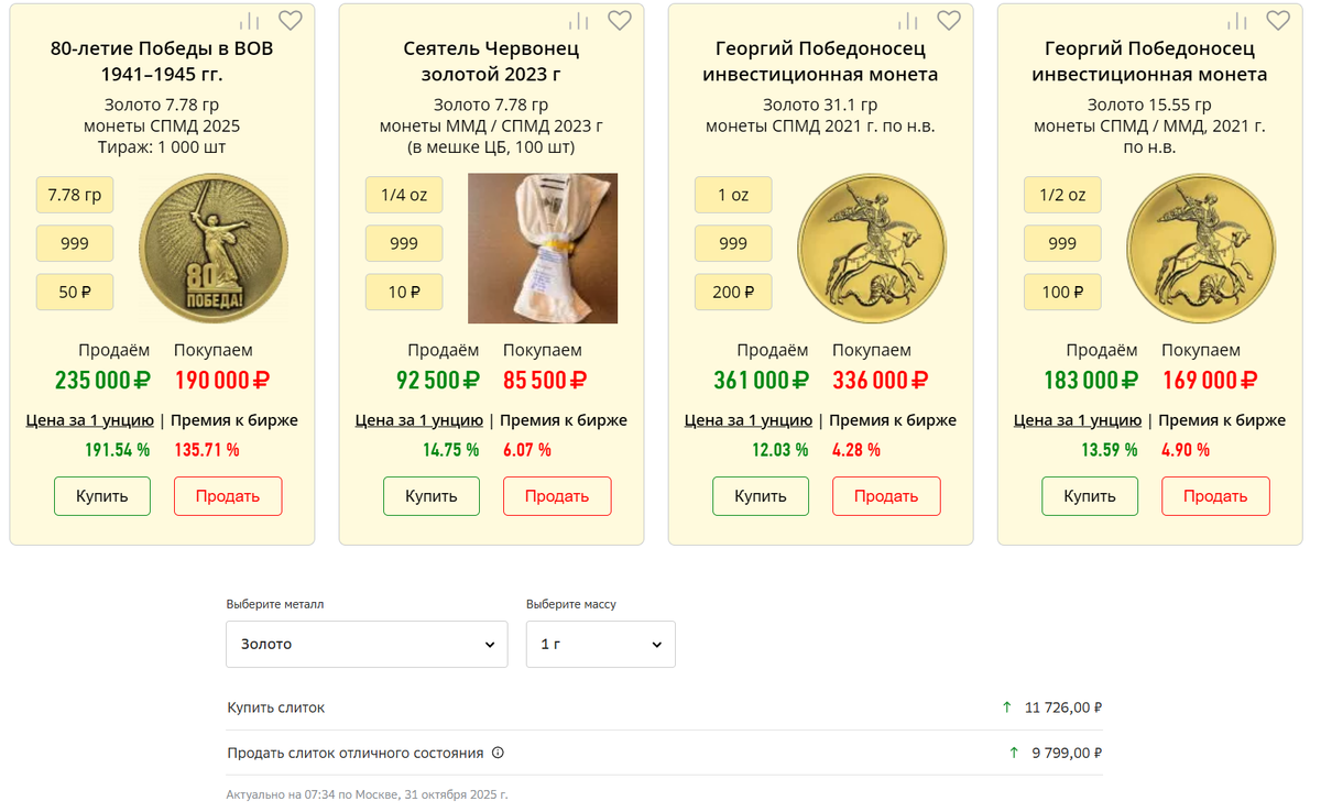 Монета 80 лет Победы - коллекционная, её тираж 1000 шт. Никто в неё вкладываться не будет. Простые Георгии по 7,78гр. и 3,11 гр. это да. Плюс мелкие слитки.