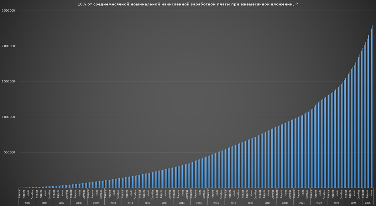 А теперь представим, что каждый раз 10% от зарплаты вносятся на краткосрочный ежемесячный вклад со ставкой равной ключевой (а в былые времена ставке рефинансирования). Через месяц вклад закрывается, сумма прибавляется к новым полученным 10% и размещается на аналогичный вклад снова. Ставка его меняется, если ключевая ставка изменилась. В реальной жизни ставка скорее всего будет выше. Мы же наблюдали, что по краткосрочным вкладам можно найти ставки выше ключевой. Но для удобства делаем как делаем.
