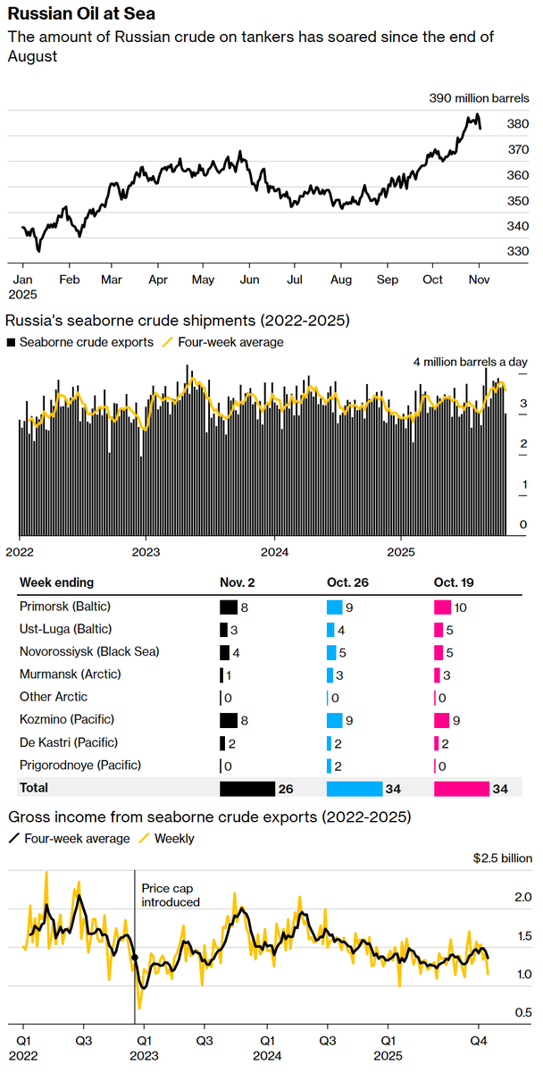 Отгрузка упала до 3,02 млн баррелей в сутки, продемонстрировав самый значительный спад с января 2024 года. Доходы Москвы от продажи нефти упали до самого низкого уровня с августа – 1,357 млрд $.