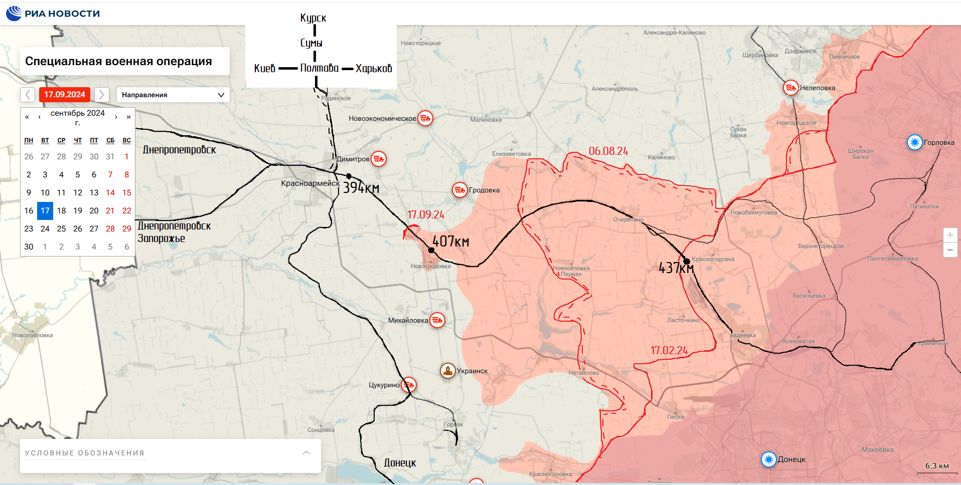 Движение линии фронта обозначено красными линиями и розоватой заливкой. После освобождения Авдеевки, ВС РФ наступали в направлении Красноармейска, с понятной целью выключить этот логистический центр у ВСУ. Наступление шло крайне тяжело, поскольку несмотря на превосходство в артиллерии и авиации с ФАБами, логистика была на стороне ВСУ и до 17.09.2024 года они возили больше имущества, чем наши, что и обеспечило низкий темп наступления ВС РФ - 4,3 км (примерно) в месяц в глубину, с шириной полосы по фронту 25 км на этом участке фронта. Логистически преимущество было у ВСУ они возили больше.
