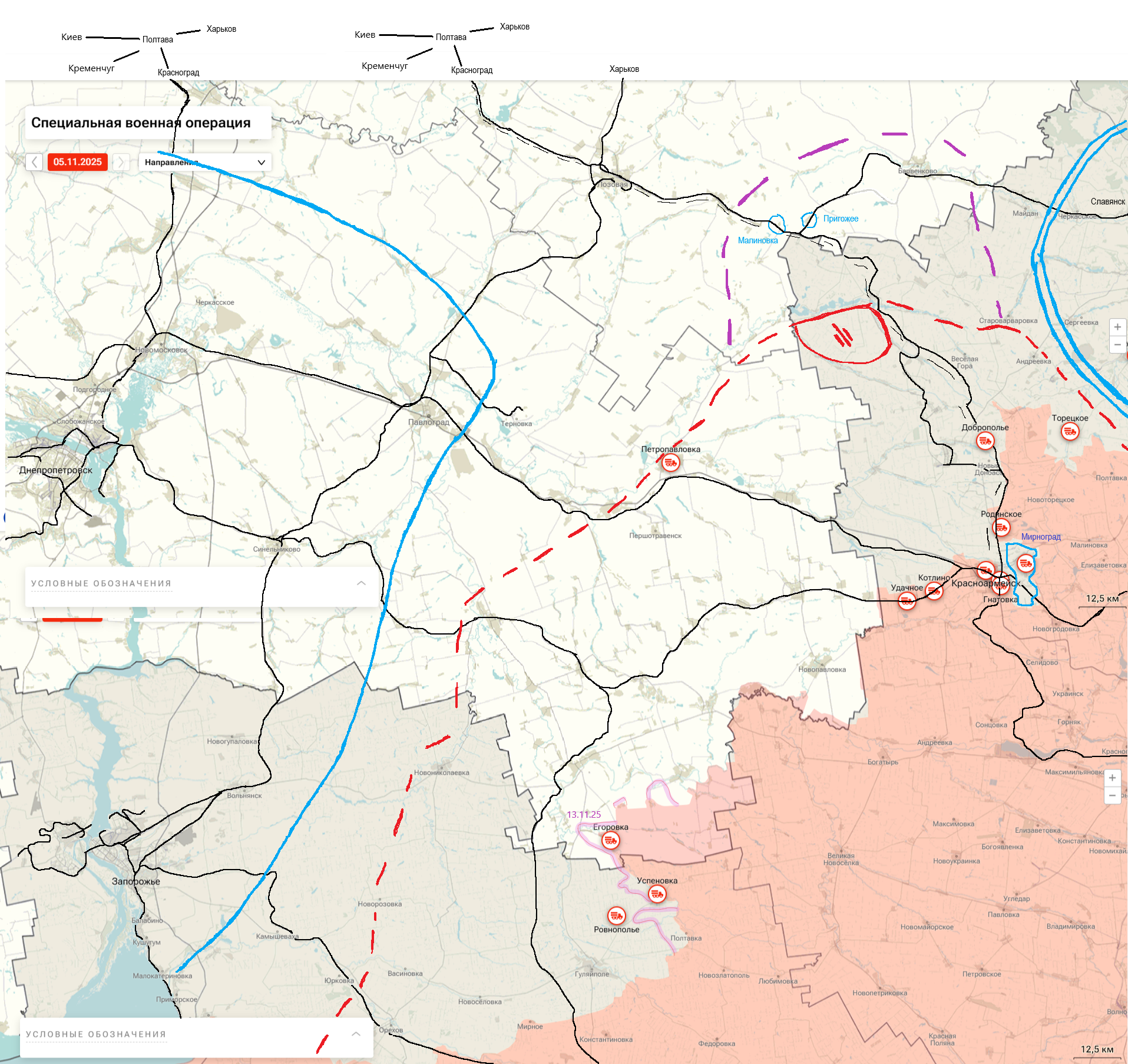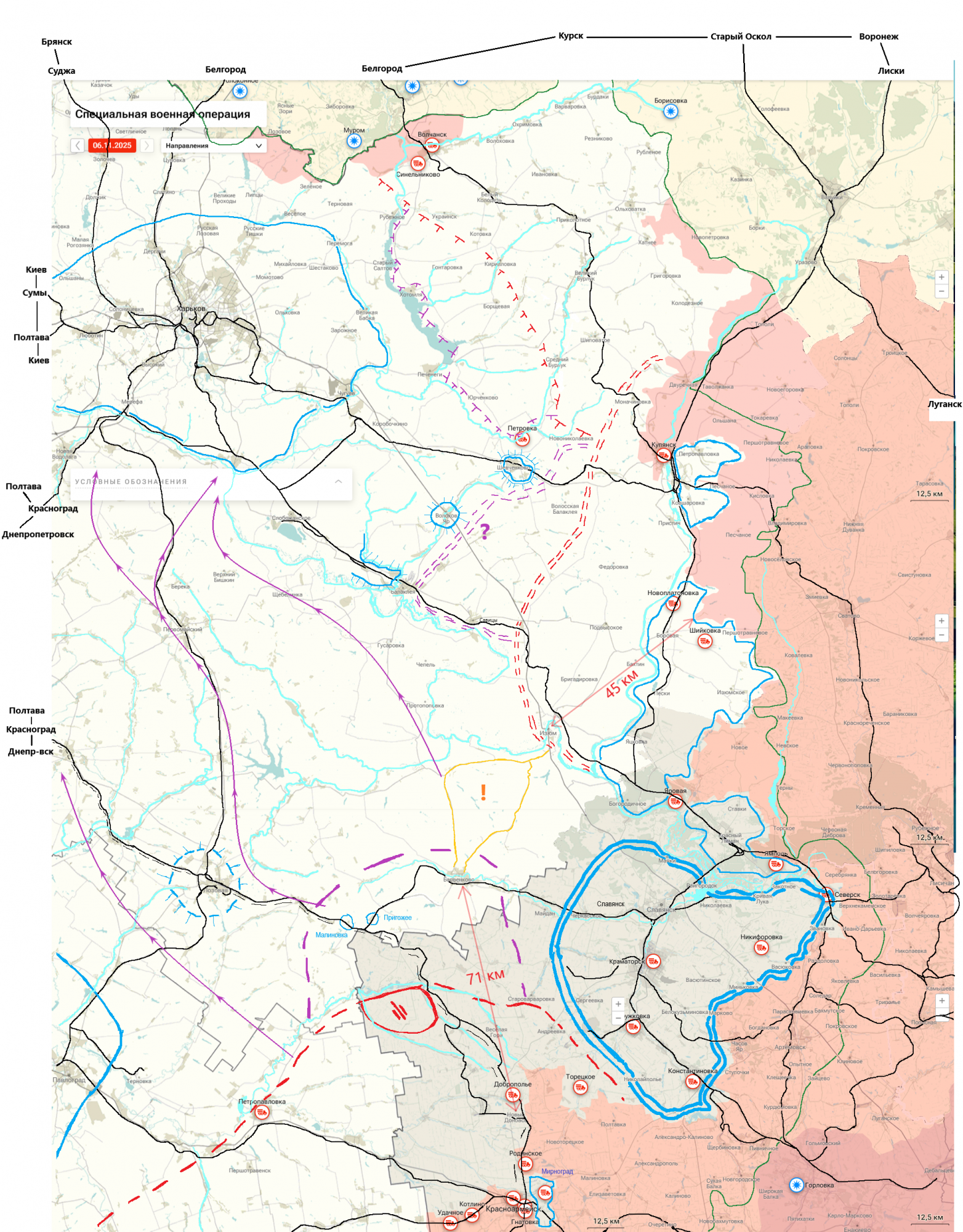 Сиреневый пунктир это Барвенково и окрестности, его занятие грозит оперативным окружением группировки ВСУ в треугольнике Славянск-Константиновка-Северск. Двойная синяя линия.