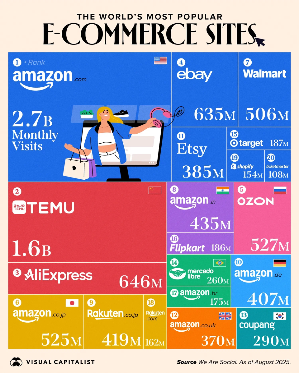 Только пять ведущих платформ электронной коммерции — Amazon, Temu, AliExpress, eBay и Ozon — обеспечивают почти 60% всего трафика.