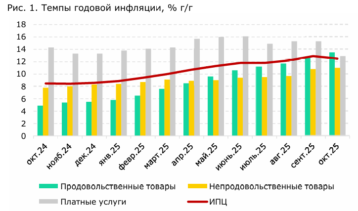 В октябре 2025 года темпы годовой инфляции впервые с начала года замедлились, составив 12,6% против 12,9% в сентябре. Месячная инфляция снизилась более чем вдвое – до 0,5%, что заметно ниже уровня октября прошлого года (0,9%).