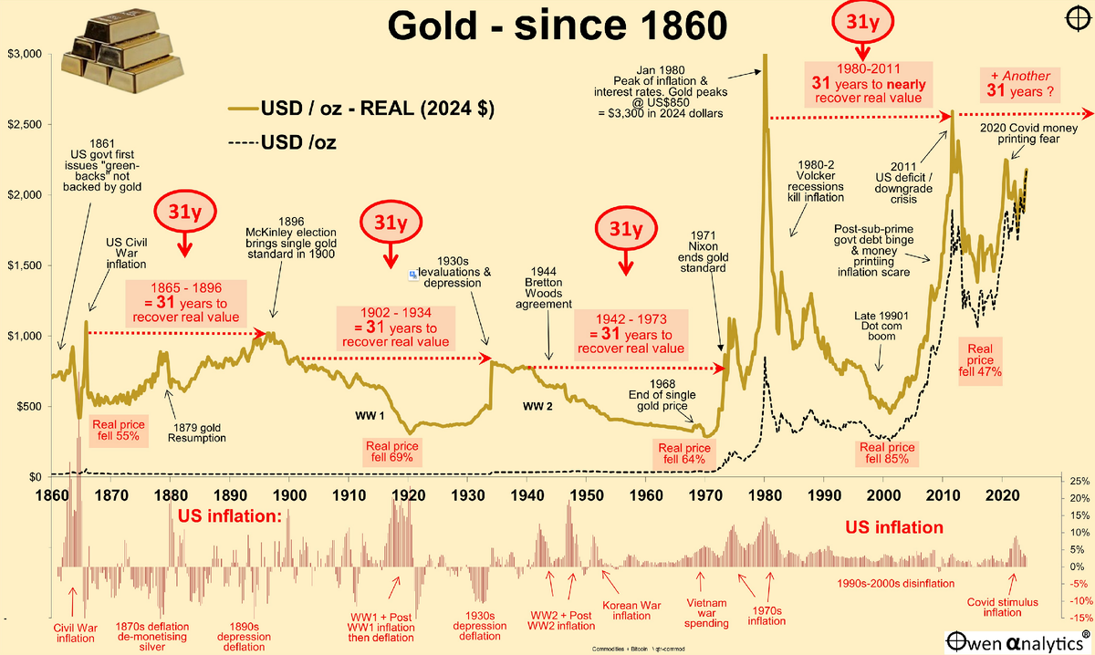 во-первых, золото опережающий индикатор, показывающий интерес к сохранению денег на фоне надвигающихся кризисов. естественно, его рыночная стоимость туда-сюда плавает в зависимости от геополитики. причем не на горизонте 30 лет, а от одной мировой войны к другой плюс-минус. сейчас наверно как раз на повестке дня WWIII
