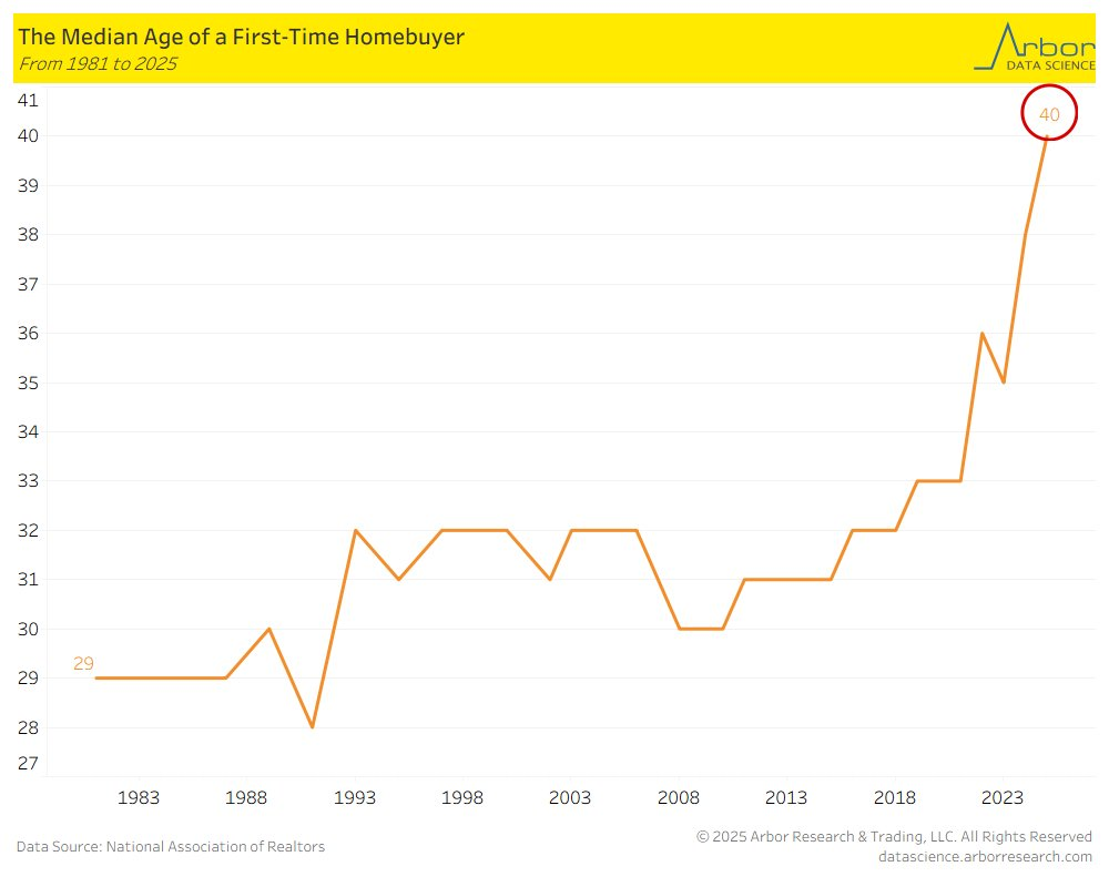 Ну что ж, я только рад за этих людей, у которых всё получается гораздо раньше, но вот, к примеру, Arbor Data Science говорит, что Национальная ассоциация риелторов США говорит, что медианный возраст людей, решивших впервые в жизни купить своё жилье за последние 44 года вырос с 29 до 40 лет.
