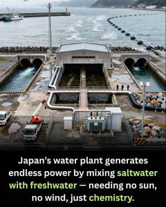 В Японии новый тип электростанции бесшумно производит электроэнергию без участия солнечного света, ветра и сжигания. Установка использует энергию градиента солености, часто называемую «голубой энергией», путем смешивания морской и речной воды через специальные мембраны. При разделении соленой и пресной воды этими мембранами ионы естественным образом перемещаются из соленой части в пресную. Это движение ионов улавливается в виде постоянного электрического тока с помощью метода, называемого обратным электродиализа.