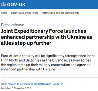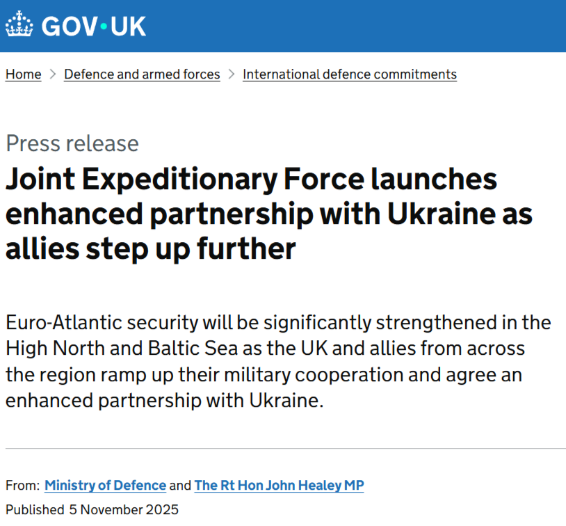 5.11.2025 gov.uk: "Объединённые экспедиционные силы начинают расширенное партнёрство с Украиной по мере усиления союзников."