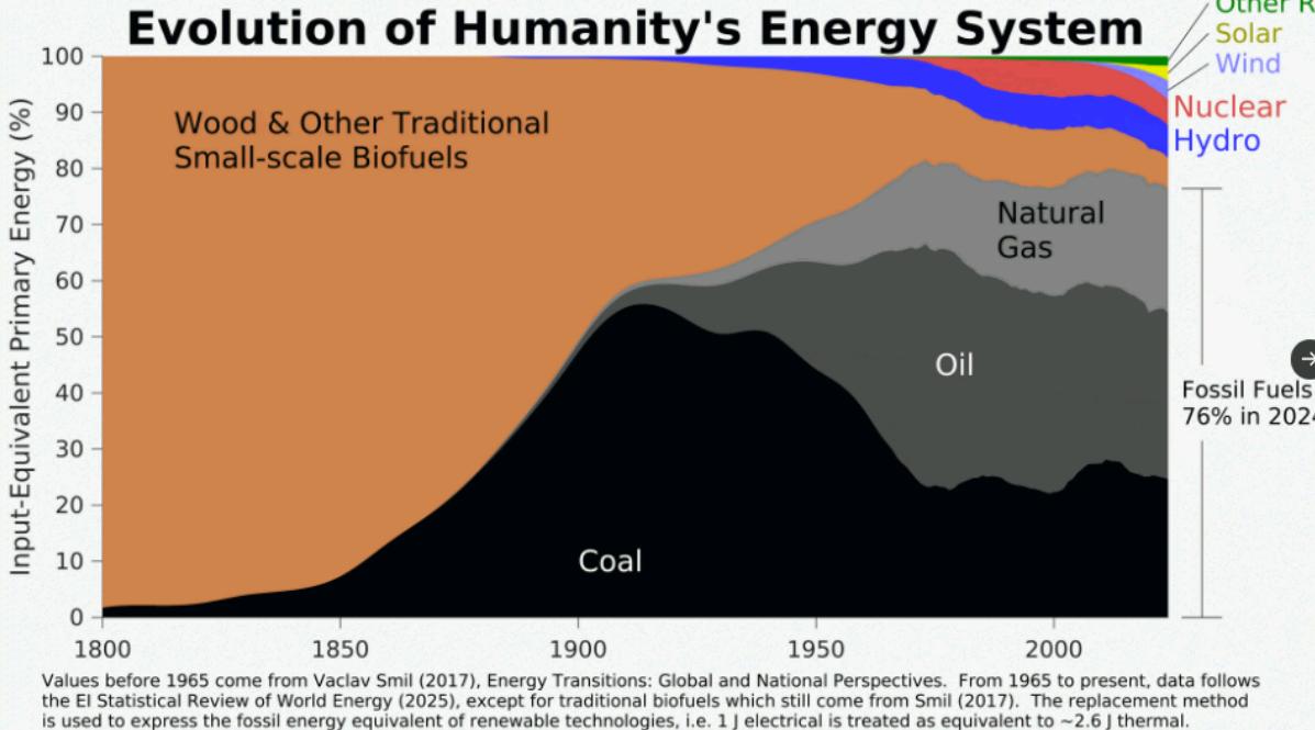 Теоретически - тепловой насос, немного биогаза, ветряк панель, с большого ветряка водород... короче ну может быть... раньше то вообще не было газа (да и атома). Вопрос только в сопутствующей побочке этого процесса отвыкания, как видим на графике каждый энергопереход кое чем сопровождался