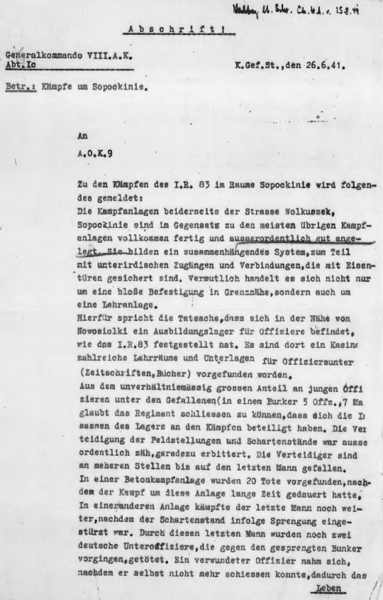 В одном бетонном оборонительном сооружении, за которое велся продолжительный бой, были обнаружены 20 тел. В другом сооружении последний из остававшихся в живых продолжал вести бой и после того, как в результате подрыва его бункер обвалился. Этот последний из защитников сумел вдобавок убить двоих немецких унтер-офицеров, подступивших ко взорванному бункеру. Раненый офицер, который не мог больше сам стрелять, покончил с собой, подорвав себя гранатой. Это подтверждает уже неоднократно отмеченный факт, что офицеров Красной армии учат тому, чтобы покончить с собой, дабы не попасть в плен.