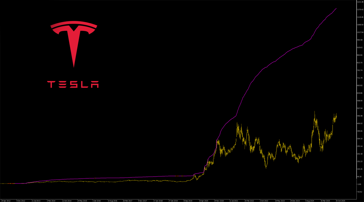 Если рассматривать только увеличение стоимости акций (без допразмещений), то цена должна вырасти с текущих 445$ до 2 670$. Моя магическая целевая кривая сейчас показывает в район 1200. Но она динамическая, рост цены будет толкать и кривую. Вот и сойдутся где-то на нужных цифрах.