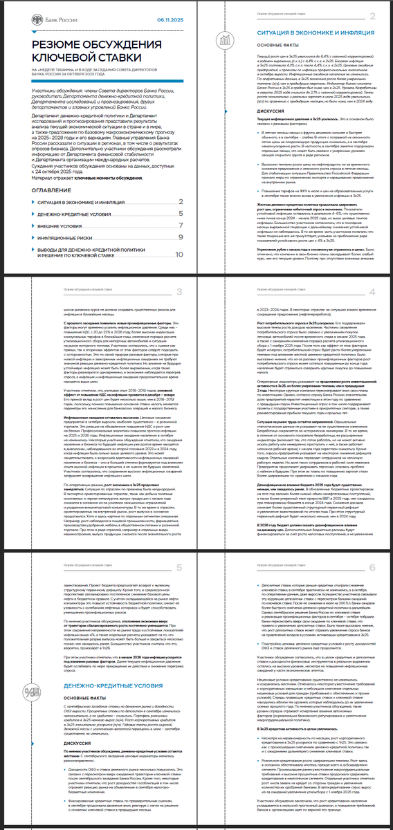 На картинке лишь часть резюме обсуждения ключевой ставки. С полным документом можно ознакомиться по ссылке: https://cbr.ru/Content/Document/File/184582/summary_key_rate_06112025.pdf