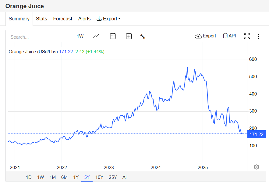 Друзья, мы с вами совсем забыли про апельсиновый джюс. А он рухнул. Загремел в тазу. Фьючерсы обновляют 3-годичные минимумы. Еще совсем недавно они были по >550$, а теперь уже по 171.