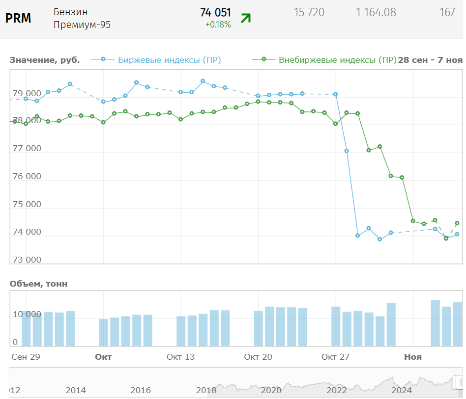 Отмечу, что данные биржевые цены, а точнее индексы, являются национальными, т.е. отражают средневзвешенные цены нефтепродуктов на местах производства в целом по РФ. Есть индексы территориальные. Если брать «Сибирь и Дальний Восток», то АИ-95 идет по 76 492, или 57,4 за литр.