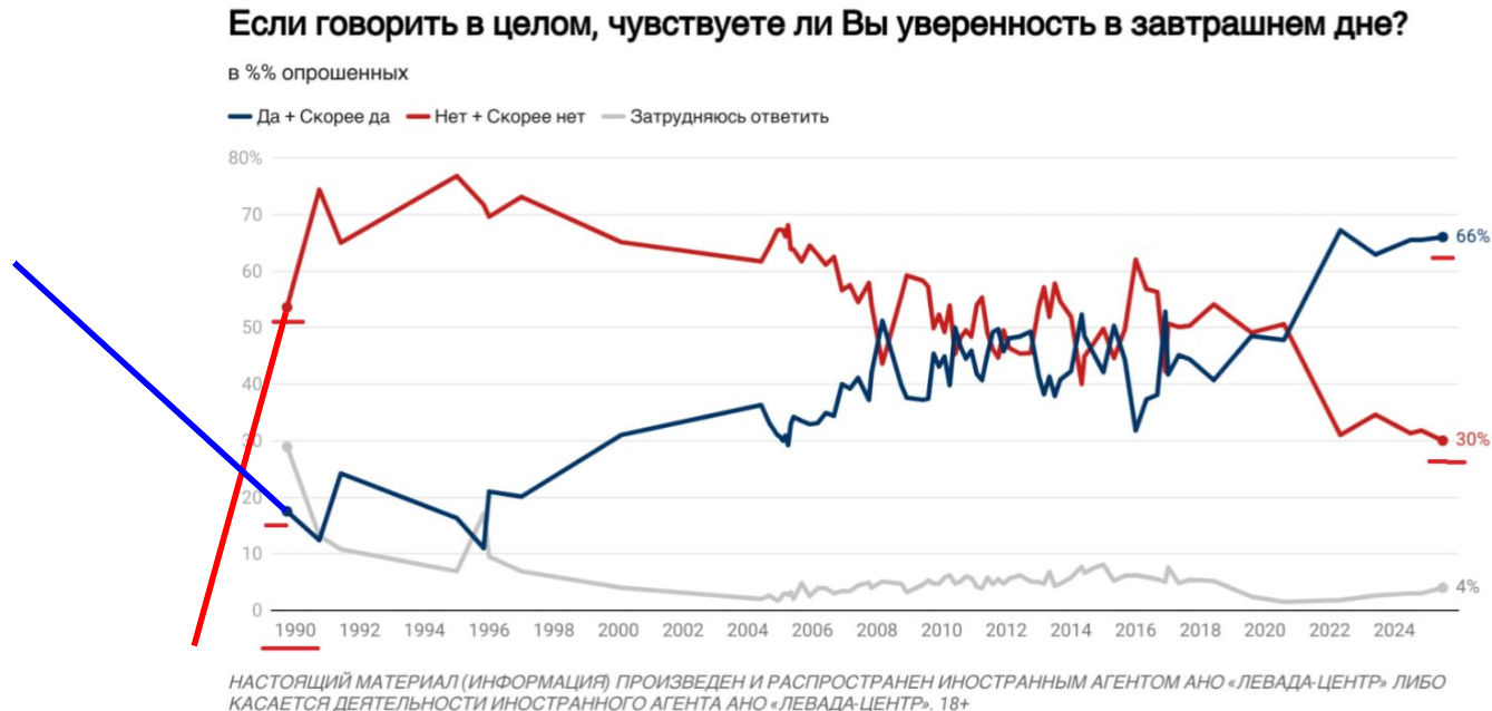 А как Буркина интерпретирует этот график? В традициях "Разлагающая пропаганда" — распространение взглядов и информации (включая ложную) с целью подорвать основы общества, моральные ценности или общественное мнение, что может привести к его дезинтеграции. Оказывается ныне ужас - ужас, скакнула в пределах (4%) ошибки таких опросов, и стало ужасней чем в 90-е, когда все было замечательно.