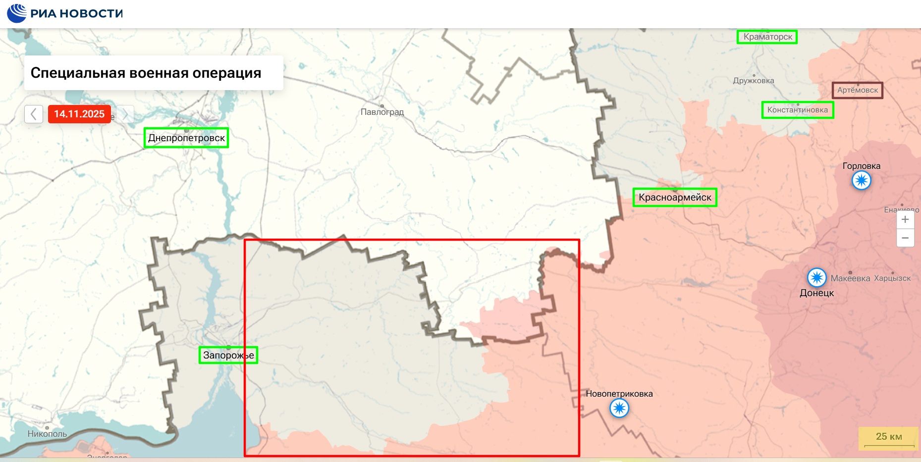 И для начала можно взглянуть на тизер, в котором на более масштабной карте красной рамкой обведена анимируемая область. Для лучшего ориентирования ключевые города, названия которых давно на слуху, также выделены рамками, но зелеными. И сразу же анимация в спойлер, там у нее 7 повторов, этого должно хватать с избытком. Но если вдруг не хватит - перезагружайте страницу или сделайте клик по анимации.