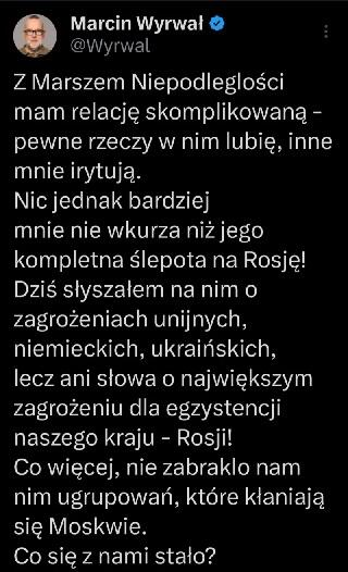 - У меня сложное отношение к Маршу Независимости – что-то в нём мне нравится, что-то раздражает. Но ничто не бесит меня так, как слепота относительно России! Cегодня на Марше я слышал об угрозах евросоюзных, немецких, украинских, но ни слова о величайшей угрозе нашему существованию – России! Более того, на нём было немало группировок, которые кланяются Москве. Что с нами случилось?).