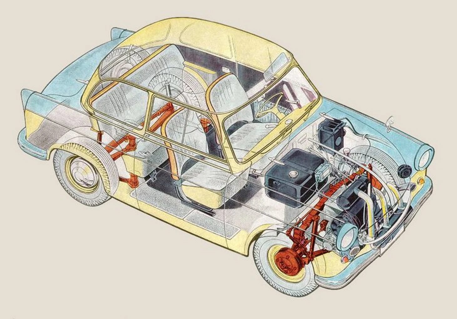 Или, скажем, можно было сделать то, о чем говорит Зилок (ZIL.ok.130) — подтянуть из ГДР конструкцию Sachsenring Trabant. Машина серийно выпускалась на заводе IFA с 1957 года, к середине 60-х избавилась от всех «детских болезней» и была прекрасным примером «народного автомобиля» — технологичного и недорогого.