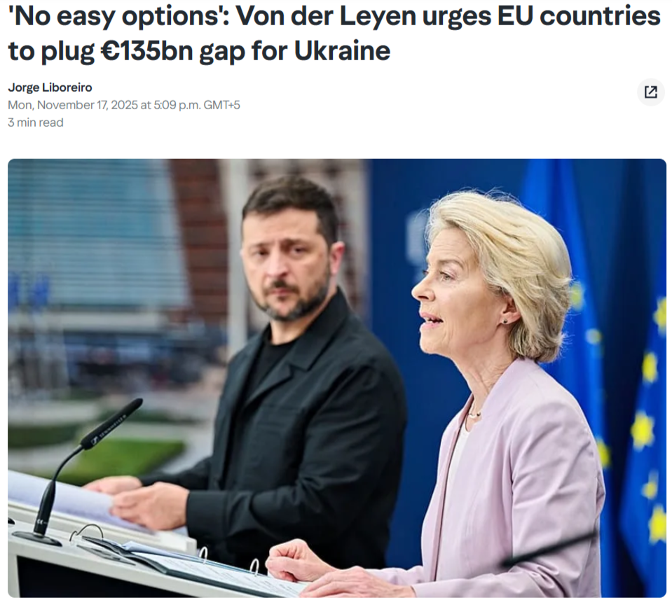 Yahoo news: Фон дер Ляйен направляет письмо государствам-членам с призывом к скорейшему достижению соглашения о финансировании огромной бюджетной дыры Украины в размере 135 миллиардов евро на следующий год и 2027 год. Лидеры ЕС встретятся на решающем саммите в декабре.